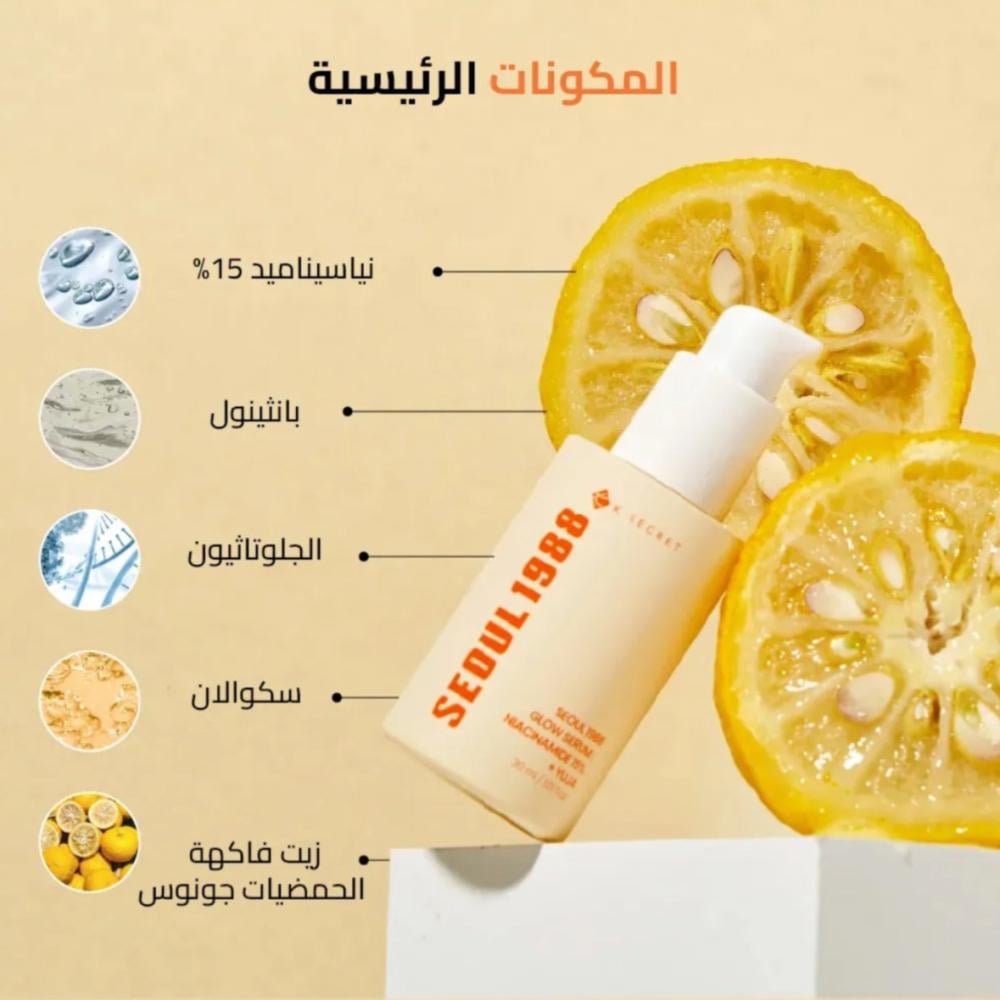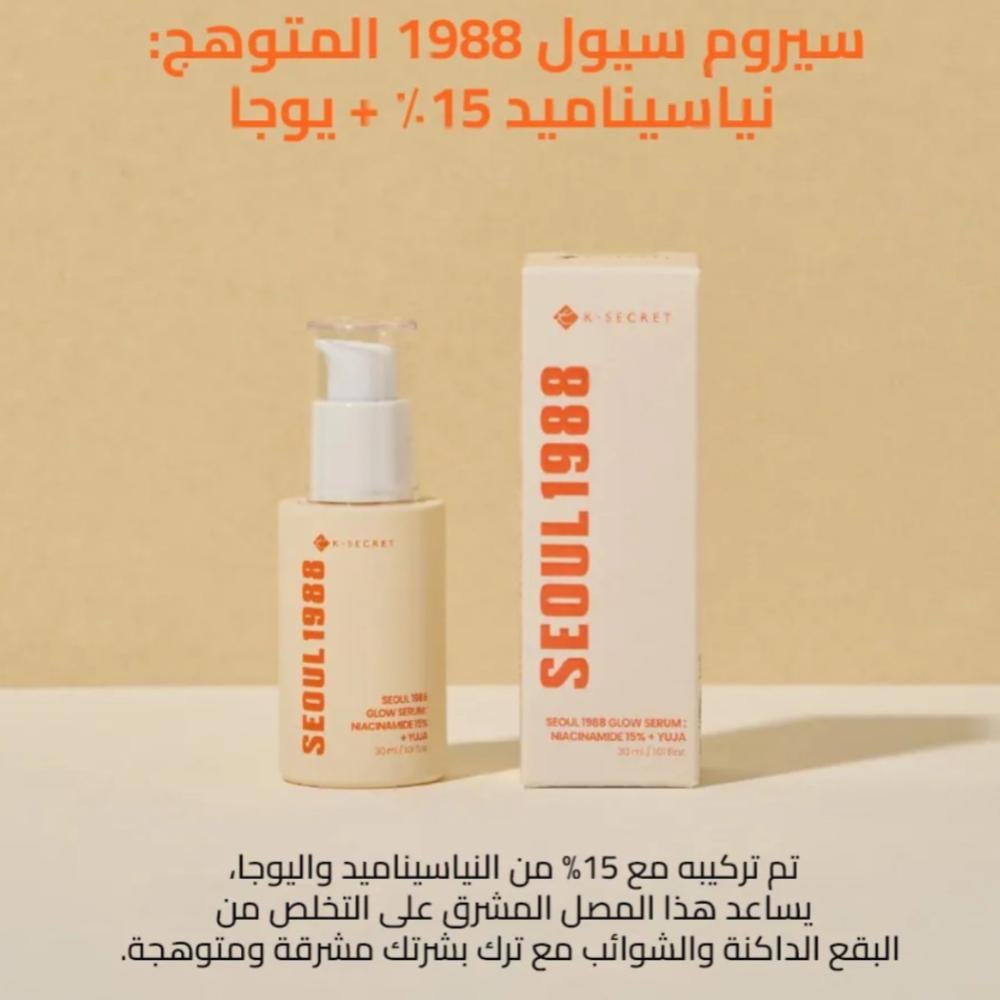 سيروم التوهج من KSECRET SEOUL 1988 بتركيبة غنية بـ النياسيناميد بنسبة 15% وخلاصة اليوجا (Yuja) يمنح البشرة إشراقًا طبيعيًا ويحسّن من توحيد لونها، ساعد على تفتيح التصبغات والبقع الداكنة، مع ترطيب عميق ولمسة ناعمة تمنح البشرة مظهرًا صحيًا ومضيئًا