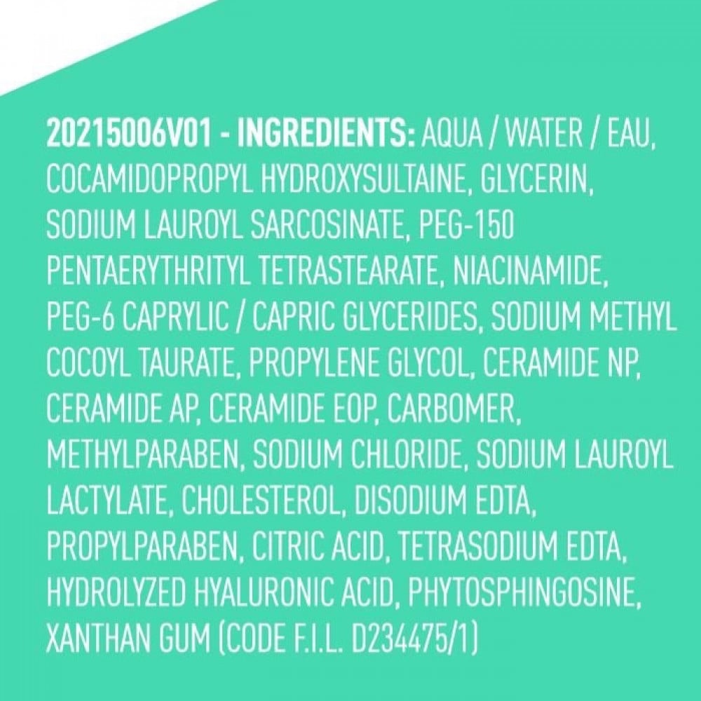 أكوا / ماء ، كوكامدوبروبيل هيدروكسيسيتينوتين ، الصوديوم لورويل ساركوسينات ، بروبانيديول ، PEG-150 Tetrastearate ، peg-6 caprylic / capric glycerides ، glycerin ، ceramide np ، ceramide ap-eop ، carbomer ، niacinamide كلوريدالصوديوم ، لاكتيلات الصوديوم ، هيالورونات الصوديوم ، الكوليستيرول ، الفينوكسي إيثانول ، ديسوديوم إدتا ، حمض الستريك ،تيتروسوديوم إدتا ، فيتوسفينجوزين ، صمغ زانثلي ، إيثيلهيكسين
