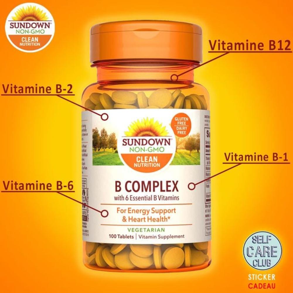 يتكون B Complex من Sundown Naturals من العديد من فيتامينات B التي تعمل معًا لدعم جهازك العصبي والرفاهية العامة