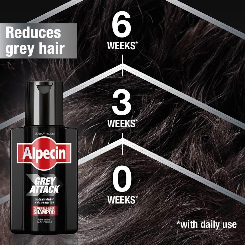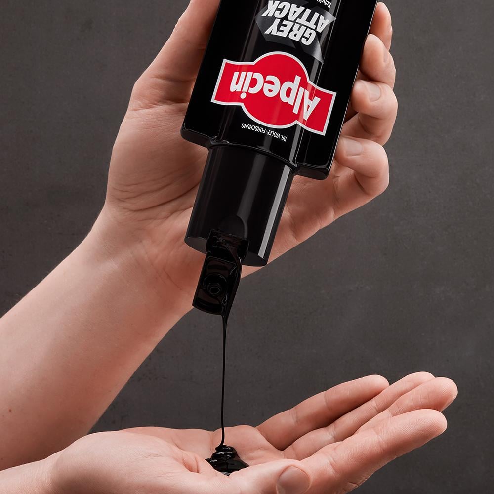شامبو Alpecin Grey Attack هو الأنسب للشعر البني الفاتح إلى الأسود كـ ملوّن طبيعي للشعر، تضمن تقنية إعادة التصبغ المبتكرة مع المكون النشط 5,6-DHI أن يصبح الشعر أغمق تدريجيًا، في الوقت نفسه، يمنع مركب الكافيين تساقط الشعر الوراثي