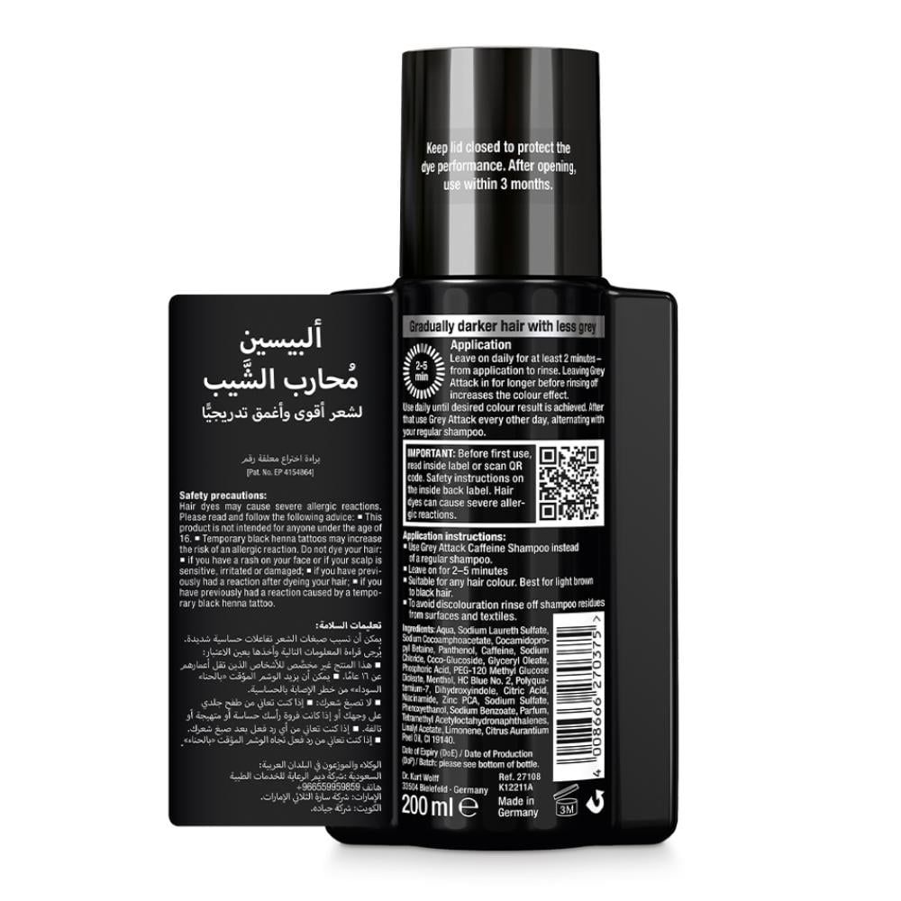 تم تطوير شامبو Alpecin Grey Attack خصيصًا لشعر فروة الرأس، يمكن أيضًا رؤية تأثير اللون في شعر اللحية إذا تم استخدامه لفترة أطول من الوقت وأصبح شعر اللحية طويلًا وفقًا لذلك