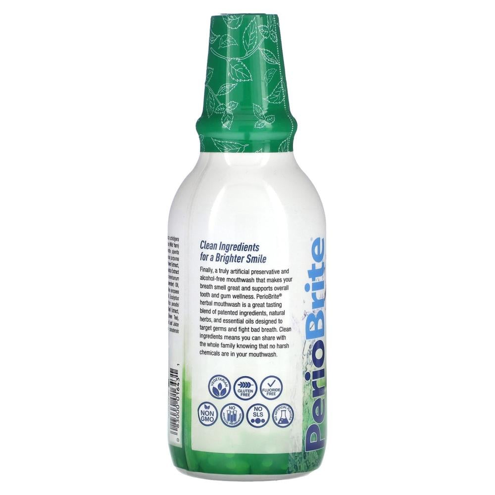 غسول الفم العشبي PerioBrite مزيج رائع المذاق من المكونات الحاصلة على براءة اختراع والأعشاب الطبيعية والزيوت العطرية المصممة لاستهداف الجراثيم ومحاربة رائحة الفم الكريهة