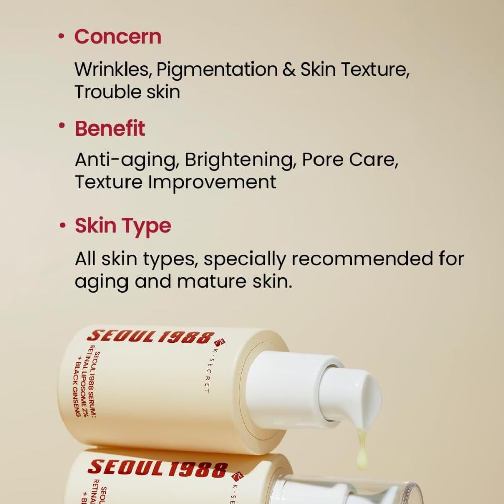سيروم "SEOUL 1988" من "K-SECRET"، للبشرة يحتوي على 2% ريتينال ليبوسوم ومستخلص الجينسنغ الأسود