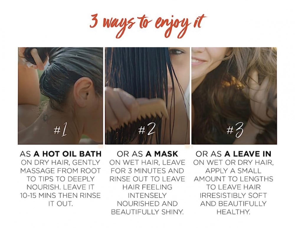 حمام زيت: يوزع الكريم على شعر جاف، ويدلّك بلطف من الجذور حتى الأطراف لتغذية شعرك من الداخل، ويترك على الشعر لمدة 10-15 دقيقة ثم يشطف الشعر بالماء