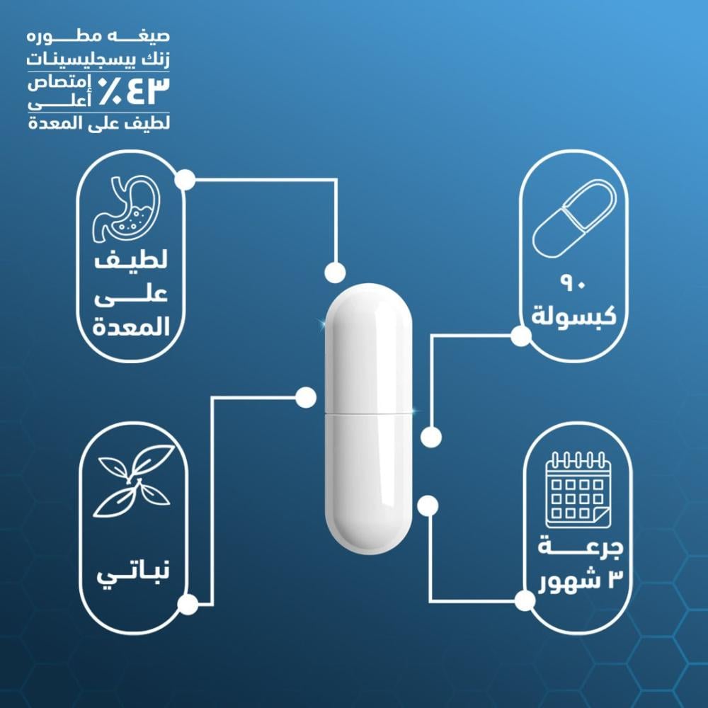 تعد كبسولات زنك بيسجليسينات لطيفة على المعدة دون التسبب بالانزعاج، تلبي 100% من قيمة الزنك اليومية الموصى بها للعناية بالصحة، تناسب البالغين، الرياضيين، والأفراد الذين يعانون من نقص الزنك أو الأعراض ذات الصلة