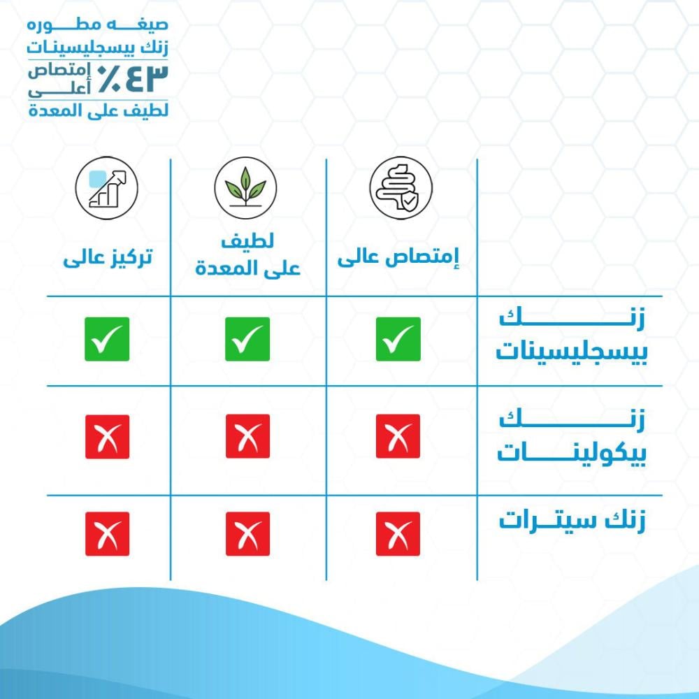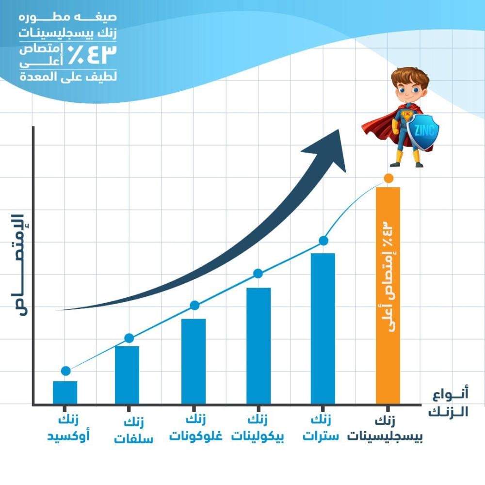يتميز زنك بيسجليسينات بأنه أعلى امتصاصًا بنسبة 43% مقارنةً بأشكال الزنك الأخرى، لتوفير فوائد الزنك للجسم بأعلى درجة